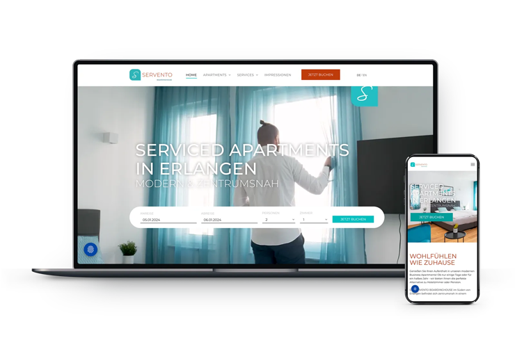Das Longstay "Servento Boardinghouse" in Erlangen bietet modern gestaltete Serviced Apartments für kurz- bis mittelfristige Aufenthalte. Die hellohotel-Seite stellt verschiedene Apartmenttypen vor, darunter STYLE S, M, L und XL. Besonders ist die Aufzählung der zentralen Lage sowie der Annehmlichkeiten wie kostenlose Parkplätze, Dachterrasse und Selbst-Check-In.